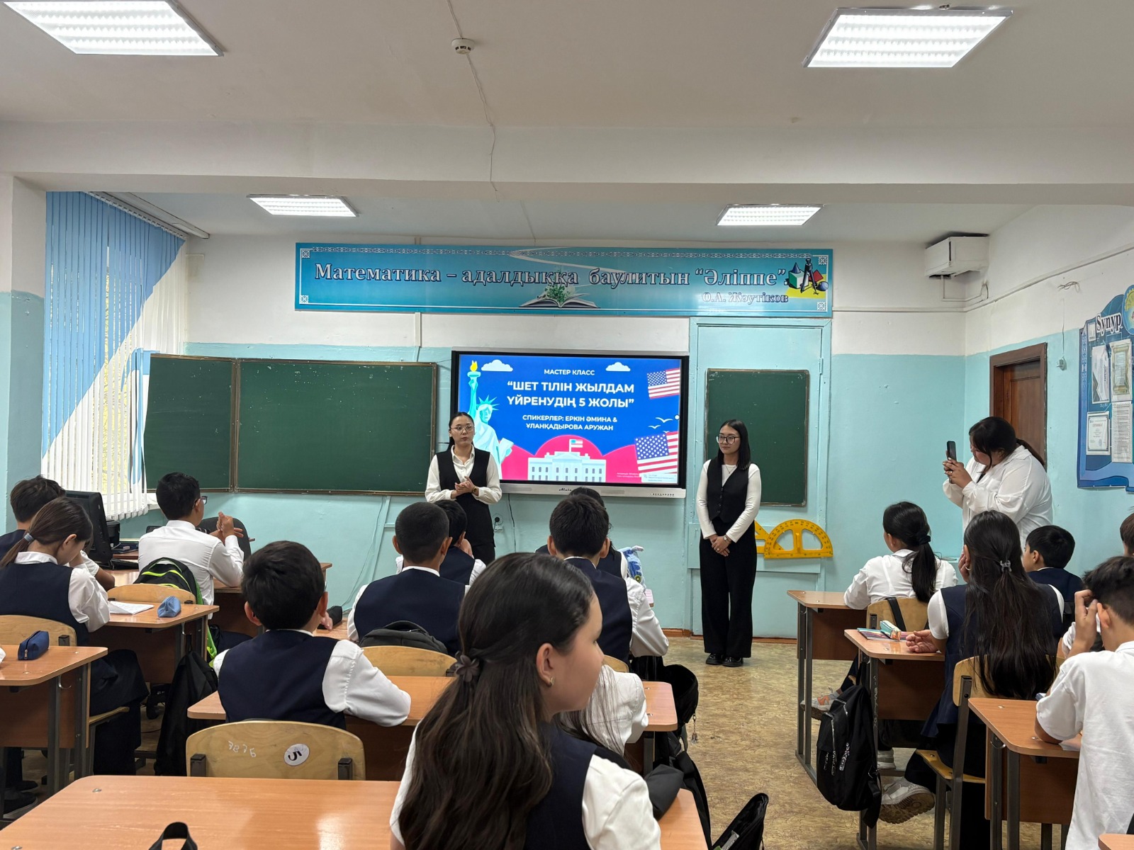 Өз білімдерін мектеп оқушыларымен бөлісу мақсатында оқу орнымыздың «Шетел тілі мұғалімі» біліктілігінің білім алушылары Ұланқадырова Аружан, Еркін Әмина шеберлік-сыныбының спикерлері ретінде «Шет тілін жылдам үйренудің 5 жолы», тақырыбы бойынша тиімді-әдіс-тәсілдермен бөлісті.