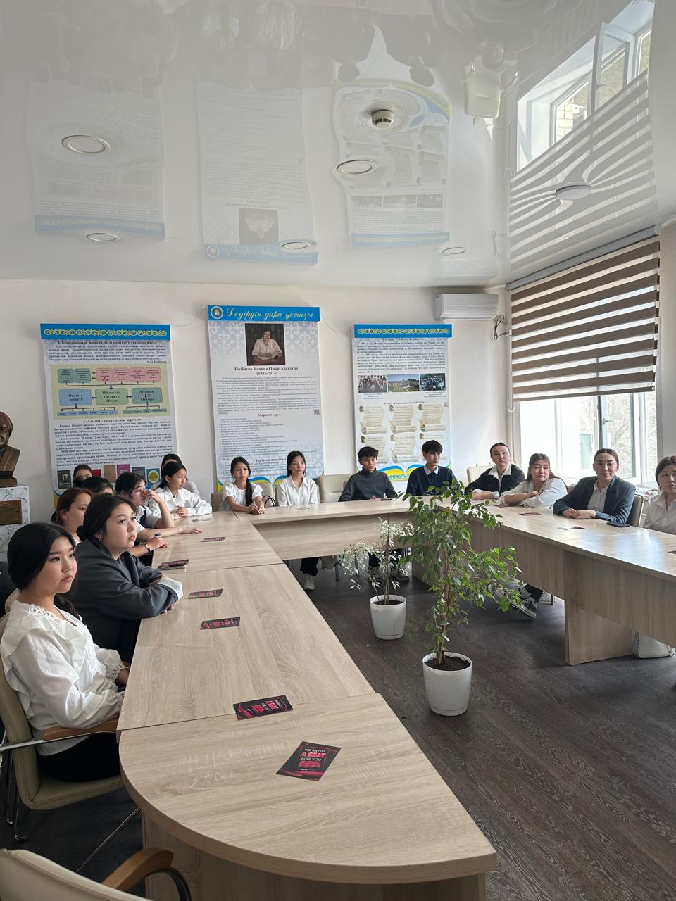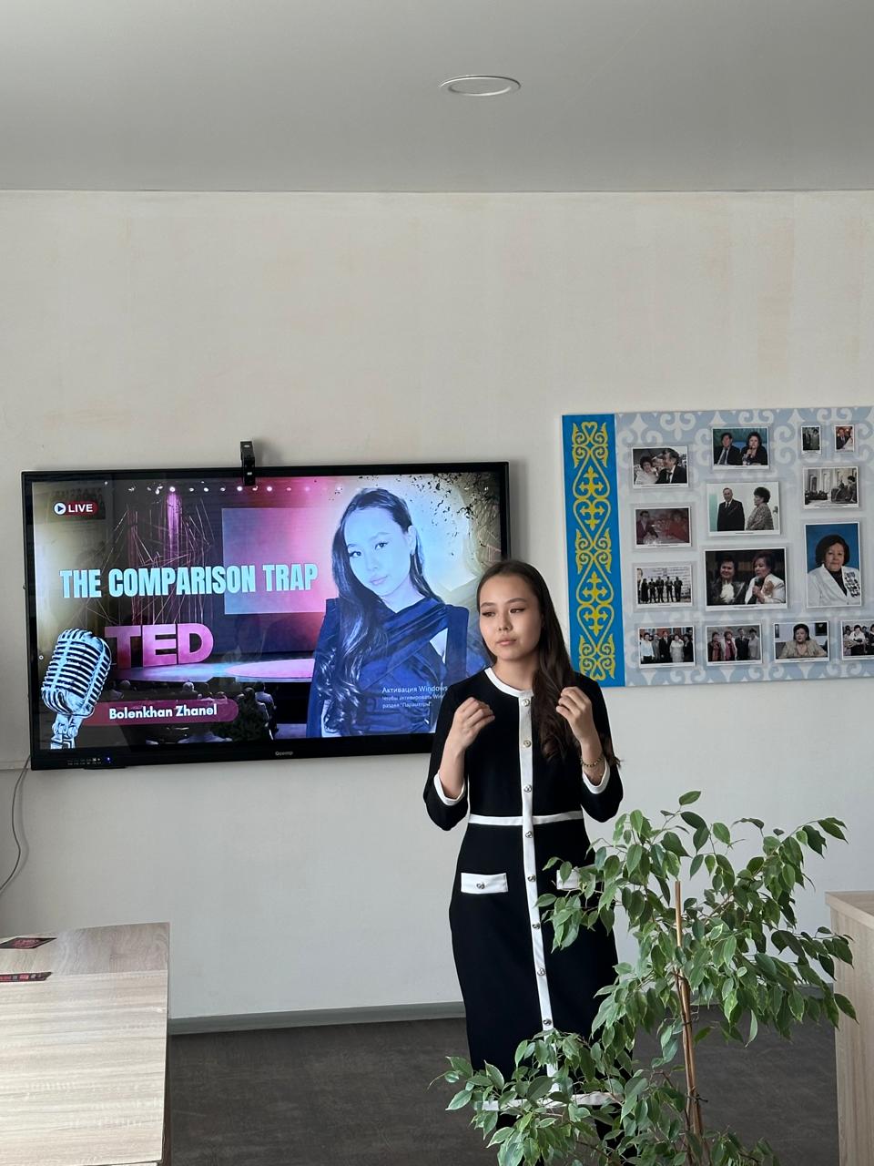 2026 жылдың 9 сәуірінде «Тілдер және әдебиет» апталығы аясында ағылшын тілі пәні оқытушысы Н.Е. Кусманова 4 курс білім алушыларымен бірлесе алғаш рет TED форматындағы
