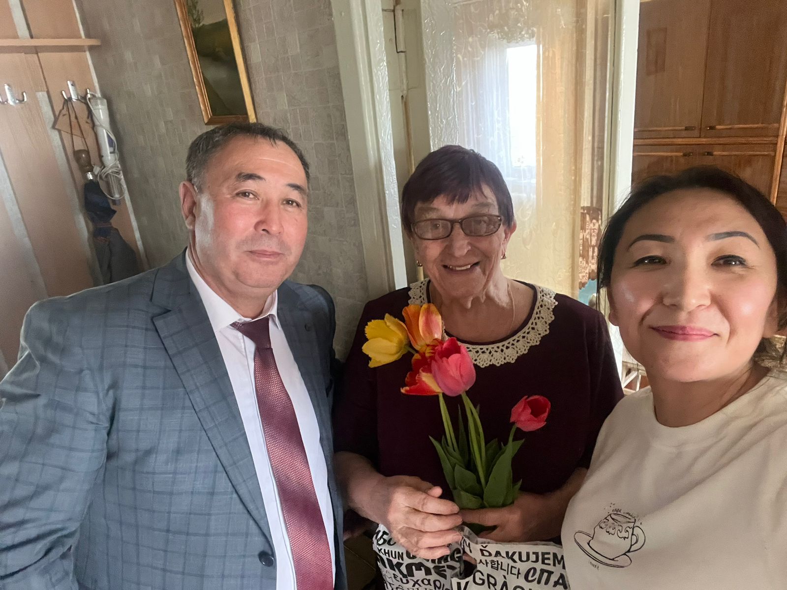 Жеңіс күні қарсаңында 06 мамыр 2024 жылы оқу орнымыздың бірінші басшысы Курманов Фархад Сақанұлы және кәсіподақ ұйымының төрайымы Даутова Жанна Оралханқызы еңбек майданында ерлік көрсеткен тыл ардагерлерін 9 мамыр – Жеңiс күні мерекелерімен құттықтап, сый-сияпаттар табыстады.