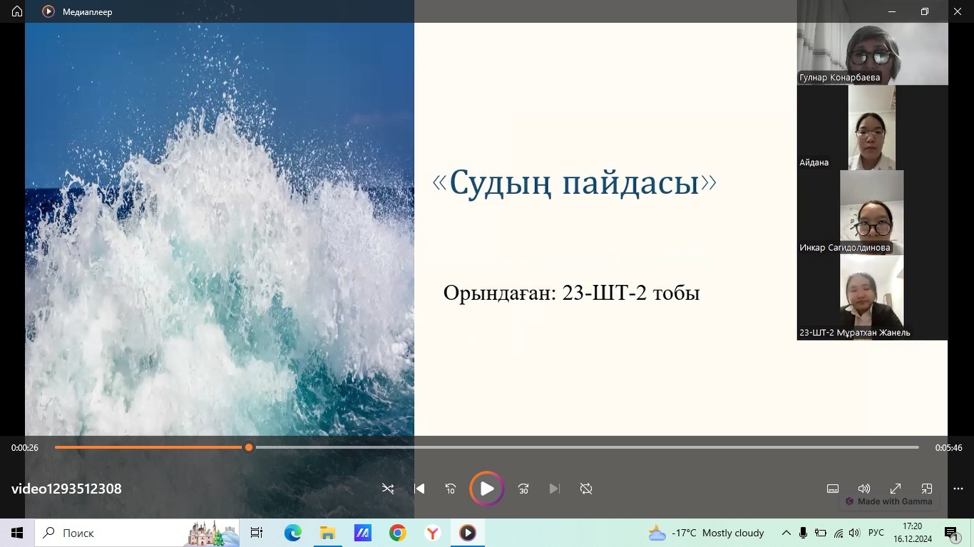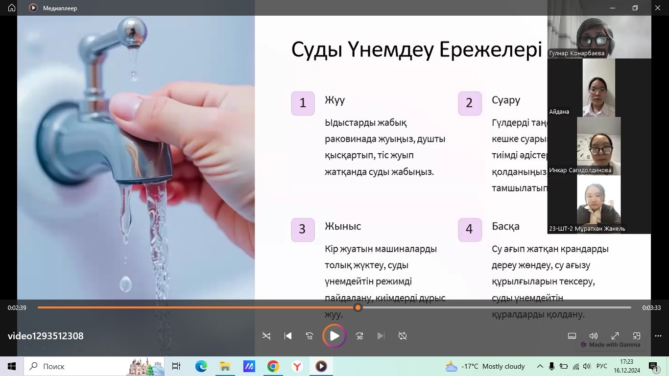 В рамках Программы воспитания «Бір тұтас тәрбие» в колледже во всех группах с 13 по 16 декабря 2024 года были проведены кураторские часы, направленные на воспитание культуры водосбережения у подрастающего поколения.