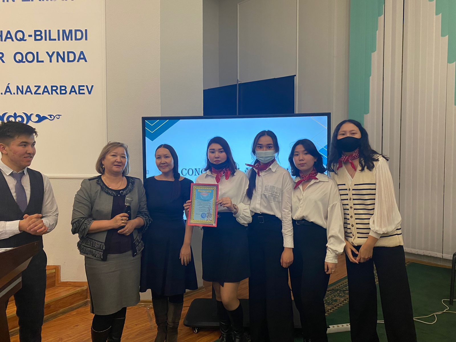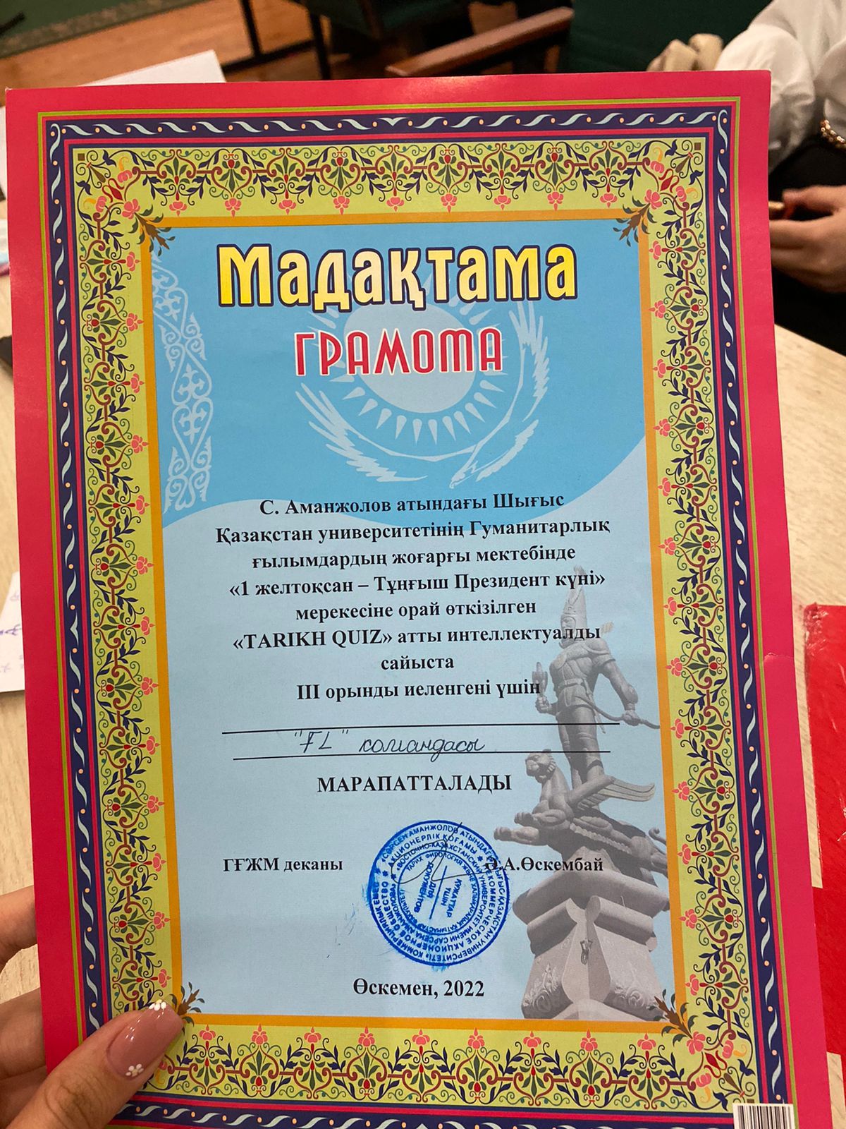 09 марта текущего года студенты 3 курса специальности «Основное среднее образование», квалификации «Учитель иностранного языка» Асанова Альбина, Каркын Аяулым, Дидаркызы Балжан, Имашева Жанерке приняли участие в городском интеллектуальном конкурсе «TARIKH QUIZ» ВКУ им.С. Аманжолова и заняли 3 место.
