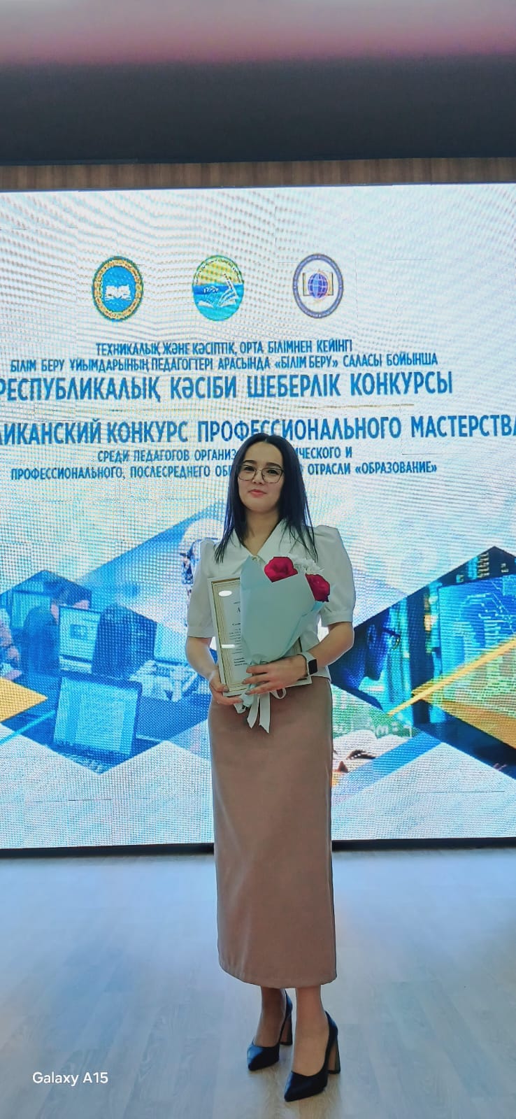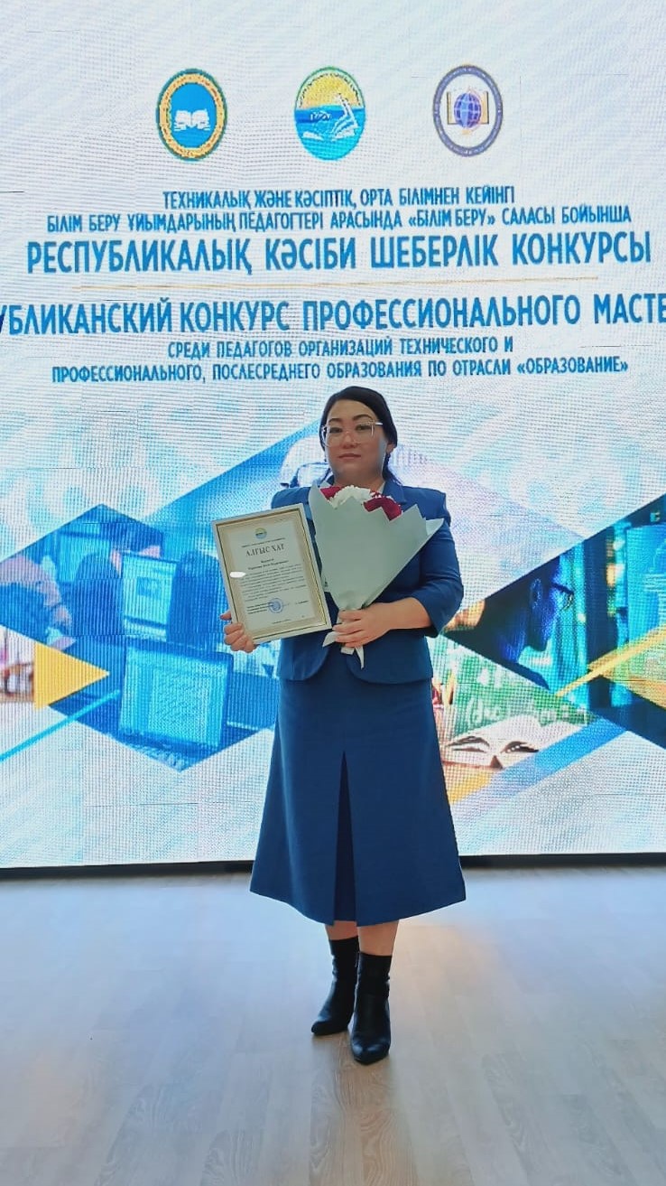 По результатам конкурса из 36 участников из 18 областей республики наш преподаватель Муратова Асем Муратовна была награждена номинацией «Профессиональный мастер».
