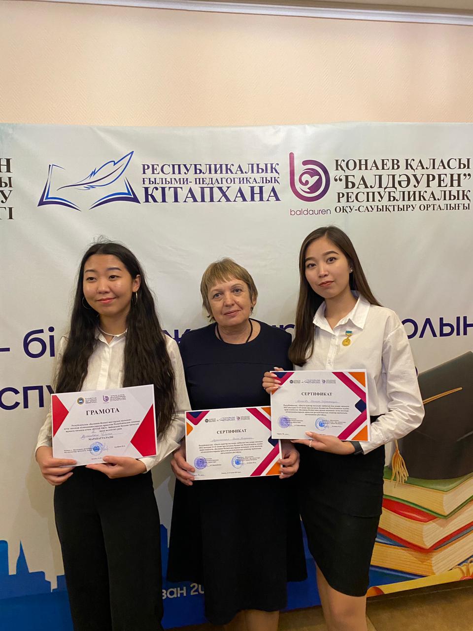 В рамках реализации проекта Министерства просвещения «Читающий колледж» 13-15 октября 2022 года на базе Республиканского учебно-оздоровительного центра «Балдаурен» города Конаев с участием Республиканской научно-педагогической библиотеки проводился республиканский семинар «Болашақ – білімді жастардың қолында», в котором участвовали заведующая библиотеки Недосекова Н.Г. и студенты группы 4-иняз-1 Касенова Жанерке и Мухаметқан Даяна. Они представляли Восточно-Казахстанскую область.
